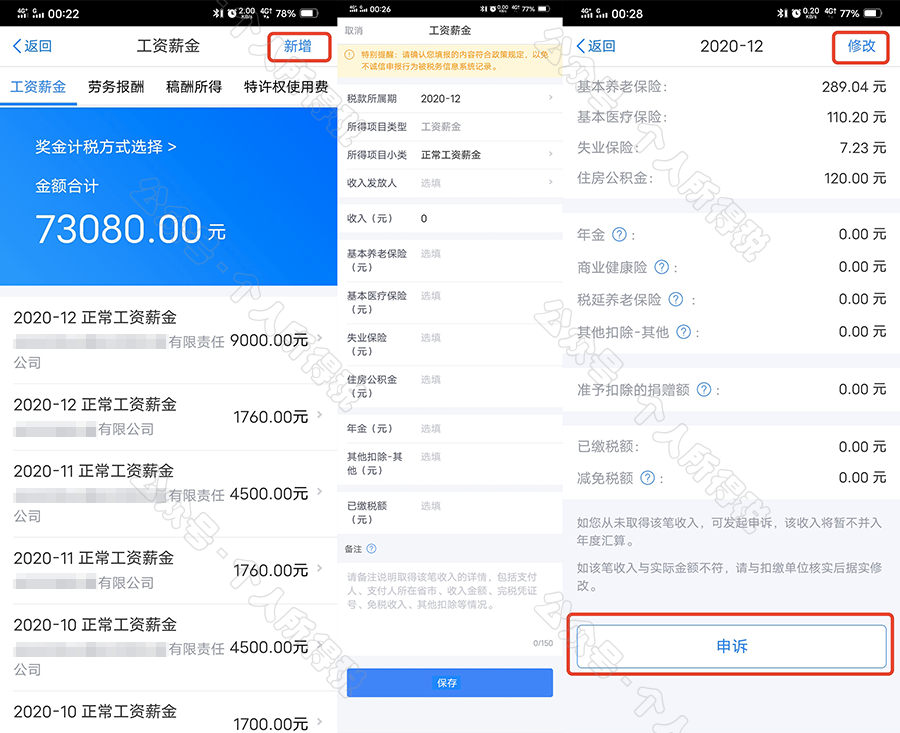 在收入列表界面,您可分所得项目,进行收入的【新增】和【修改】。如该笔收入与实际金额不符,请与扣缴单位核实后据实修改。如您从未取得该笔收入,可发起【申诉】,申诉后,该收入将暂不并入年度汇算。