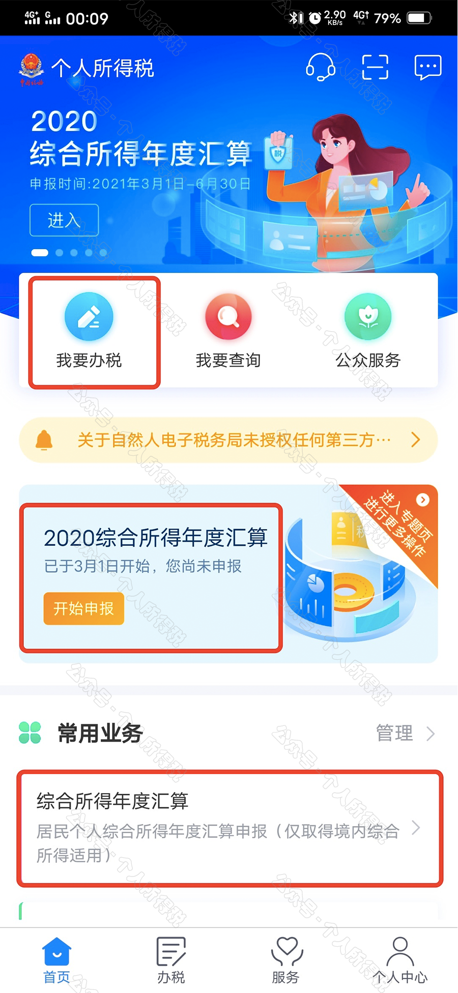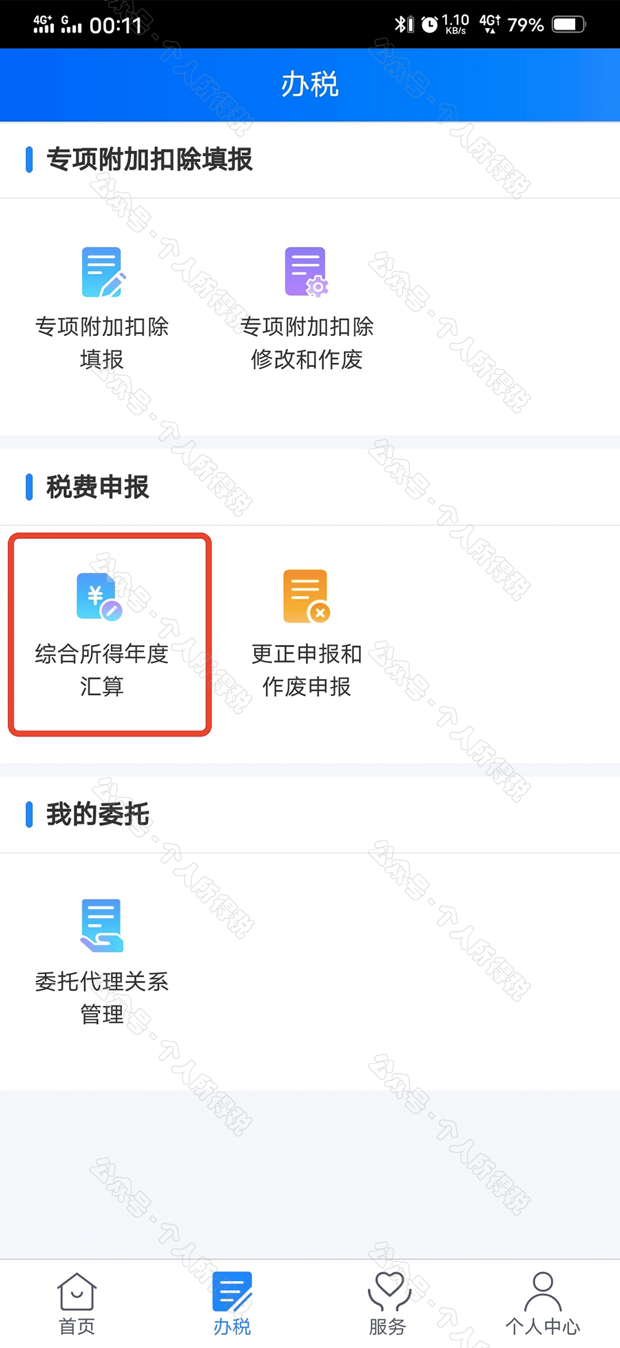 三是从【快捷入口】-【我要办税】下或底部【办税】菜单进入后,点击在【税费申报】下的【综合所得年度汇算】。