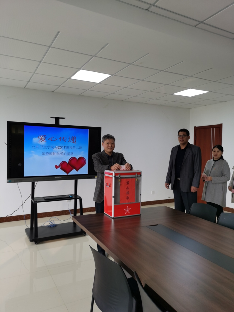 为深入开展“不忘初心、牢记使命”主题教育,为身边群众办实事好事。 11月8日,公共卫生学院党总支在学院会议室举办了“爱心点燃希望,真情传递温暖”为身患急性肾衰竭的学生募捐活动。党总支书记、院长张春芝带领教职工积极捐助,共同谱写了一曲爱的乐章。