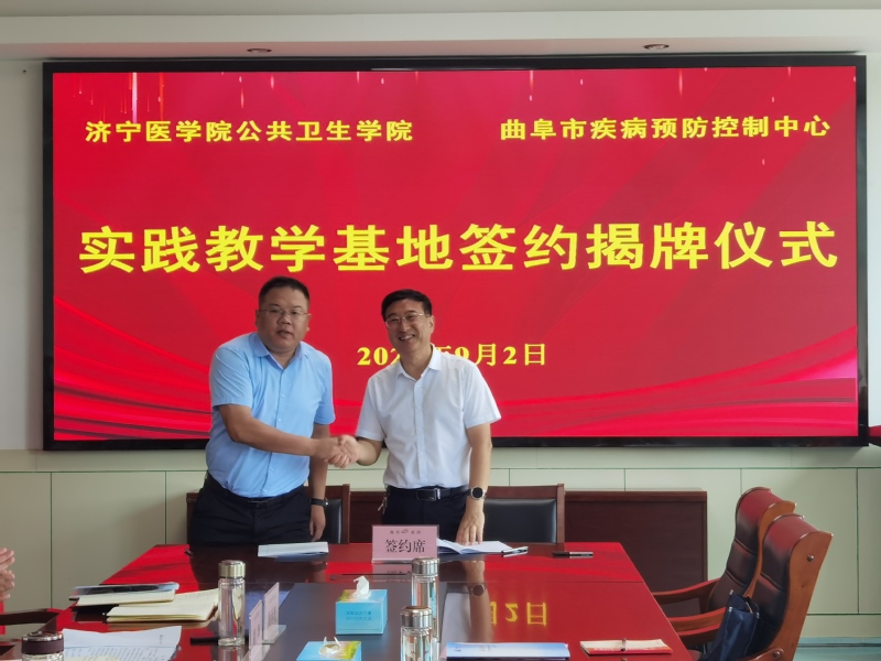9月2日,济宁医学院实践教学基地签约揭牌仪式在曲阜市疾病预防控制中心举行。公共卫生学院党总支书记卫明武、院长林立,曲阜市疾控中心党总支书记兰玉杰、主任胡翔出席活动。