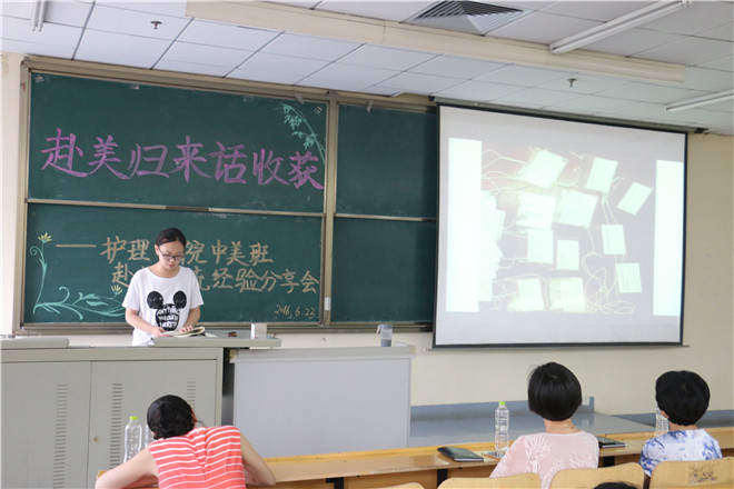 6月23日下午,护理学院中美班赴美交流经验分享会在教学楼309教室热烈举行。本次会议的主题是“赴美归来话收获”,护理学院副院长陈玉芹、刘鹏飞与2014级、2015级中美班130余名同学一起参与本次活动。