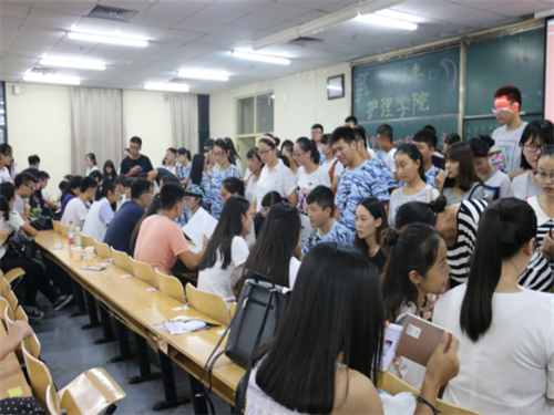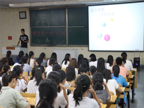 2016年9月7日19时30分,护理学院学生会第一轮纳新大会在教学楼311教室举办。护理学院学生会主席魏闪、副主席许静、副主席于跃、副主席倪亚南、副主席李姝敏出席,学生会各部门成员以及2016级全体新生一起参加本次纳新大会。