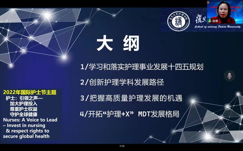 王文军主持论坛,他对出席专家学者表示热烈的欢迎并介绍了本次论坛的流程和主要内容。胡雁以“高质量发展背景下创新护理学科发展多元化拓展路径”为主题,从人才培养、科学研究、护理质量、国际交流多角度探讨护理学科的发展路径,把握多元化护理学科的发展机遇。