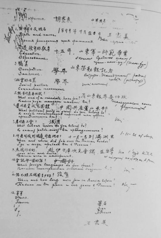 王尽美参加远东各国共产党及民族革命团体代表大会填写的调查表