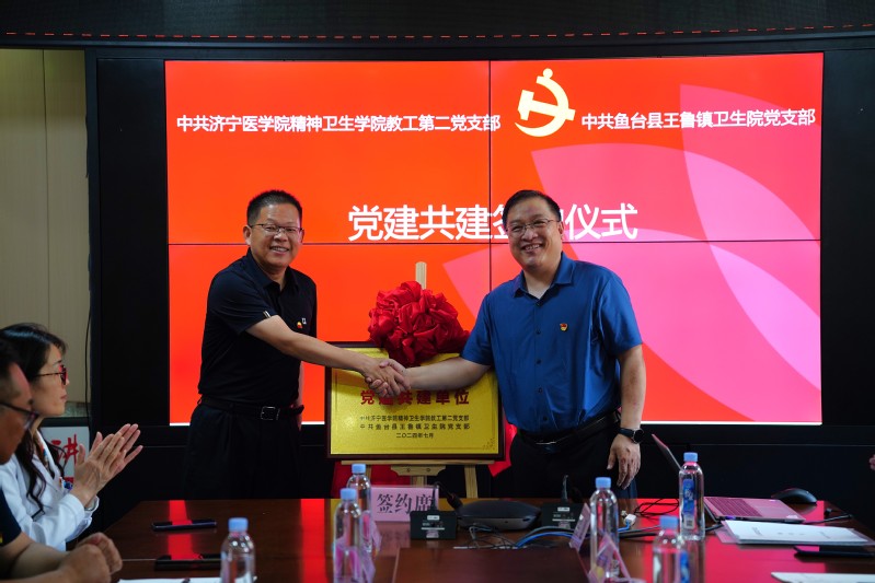 为搭建“共建、共享、共进”的党建平台新格局,强化校地融合发展,增强社会服务成效,推动精神卫生事业的发展,7月18日,精神卫生学院教工第二党支部与鱼台县王鲁镇卫生院党支部举行结对共建签约仪式。鱼台县卫生健康局党组副书记、局长刘占锋,精神卫生学院党总支书记黄广传,山东省省派工作队队员、基础医学院副院长任启伟出席仪式。仪式由王鲁镇卫生院院长李鹏主持。
