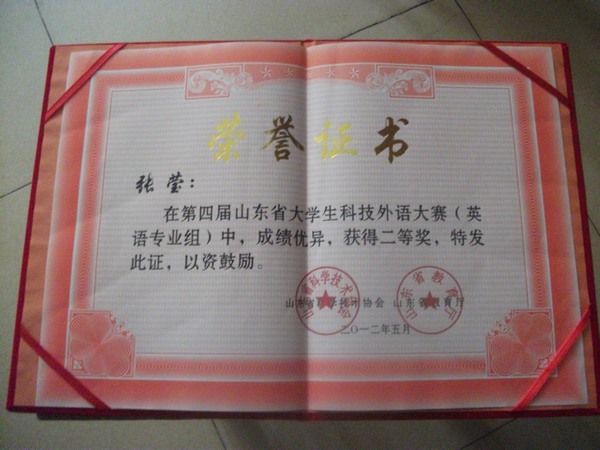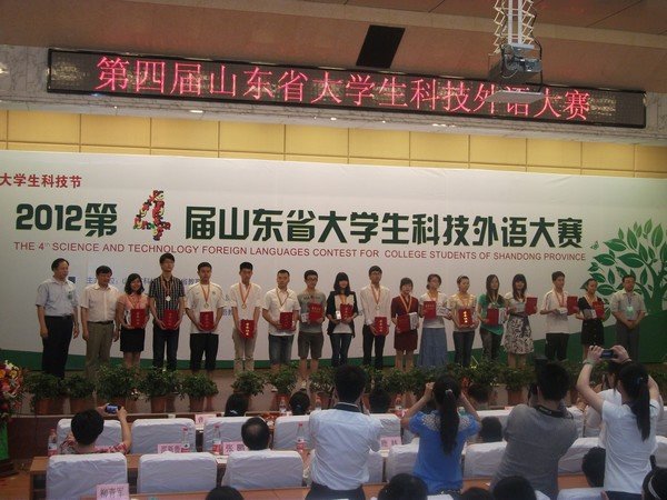 5月25日 ,由山东省科协、山东省教育厅主办的“第四届山东省大学生科技外语大赛”在山东交通学院(长清校区)圆满落下帷幕。我校外语系2009级英语专业学生张莹,凭借其扎实的语言知识基础、流畅的英语口语和良好的竞技水平,在复赛中成绩突出,获得大赛专业组排名第十,二等奖中排名第一的好成绩;我部教师袁国廷获得“优秀指导教师”的荣誉称号。