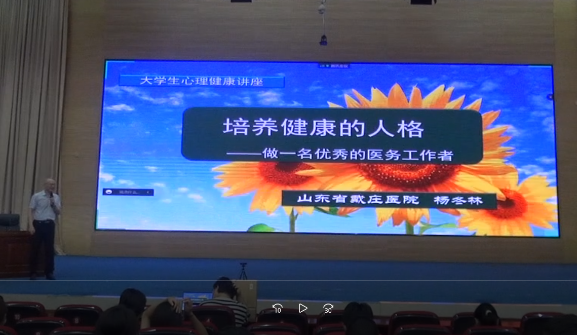 杨冬林以《培养健康人格,做一名优秀的医务工作者》为题,通过大量的案例阐明了培养健康人格的重要意义,深刻分析了人格障碍的种类和影响因素。他结合自身经历,就培养健康人格的方法作了深入浅出、精彩生动地讲解。他教育学生们,不仅要重视自身人格的发展,不断改善人际关系,提高人生价值,而且要学会与有人格障碍的人相处,做一名自尊自信、理性平和、积极向上的优秀医务工作者。